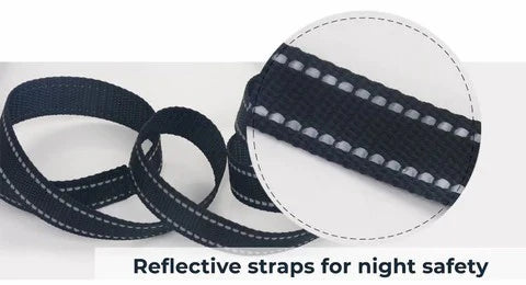 The integrated adjustable reflective harness keeps your dog visible and secure during evening walks. You can attach your leash directly to the harness — no need for an extra one underneath.